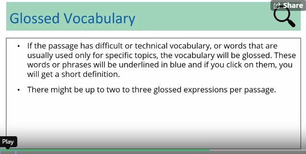 When doing the reading section, the question is on one side of your screen and the passage is always available on the other side. When you start each reading passage, it's best to read it quickly. Many of the questions will refer to a specific paragraph, so you can then re-read that section. You don't want to run out of time! Also, you can click through all the questions of a given passage, so you don't have to answer them in order. Answer all the ones you think are easy and then use the rest of your time to do the harder questions. To make sure you don't miss any, there is a review button that will open up a screen listing all the questions and show if they were answered or not. There are links that allow you to quickly go to any question.
